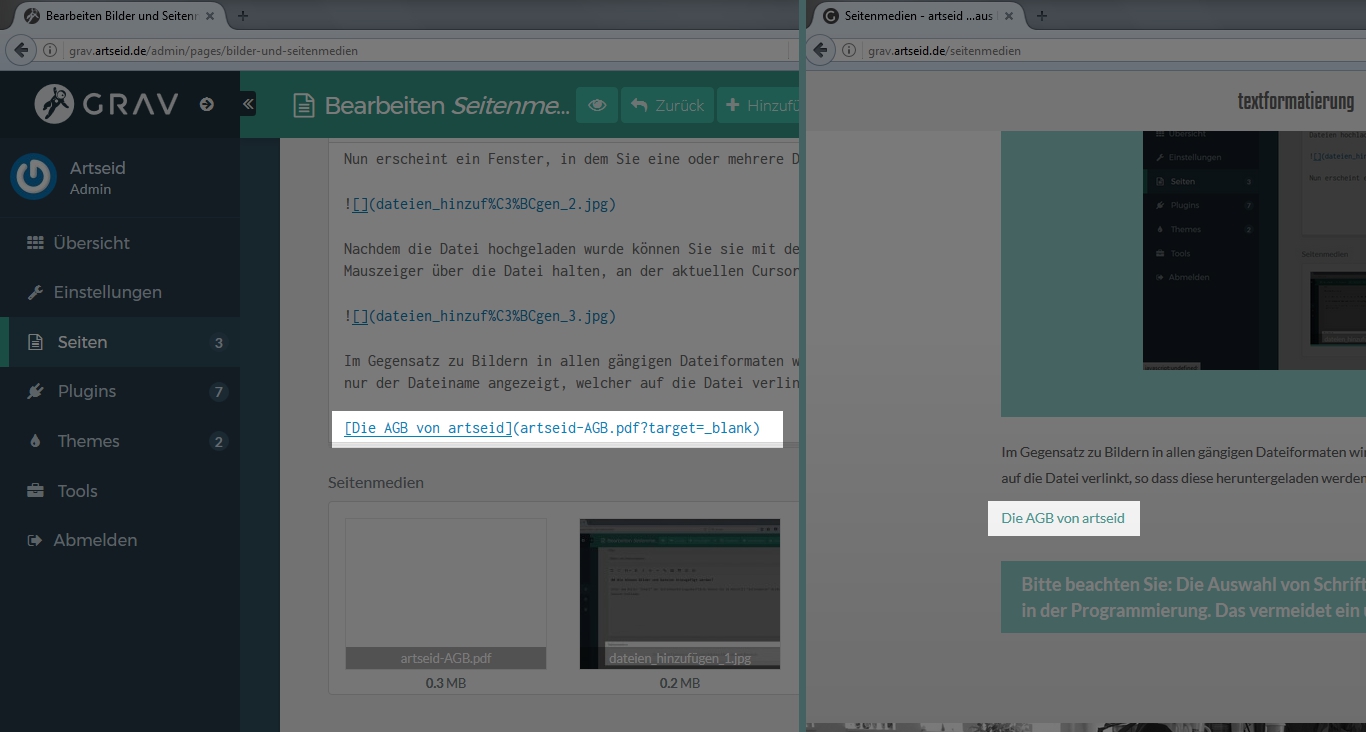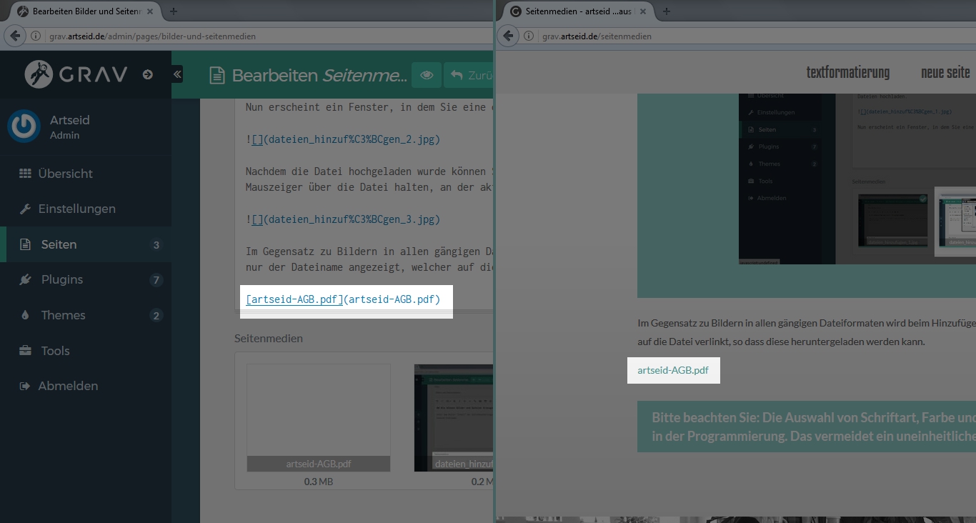 Im Gegensatz zu Bildern in allen gängigen Dateiformaten wird beim Hinzufügen von anderen Dateien standardmäßig nur der Dateiname angezeigt, welcher auf die Datei verlinkt, so dass diese heruntergeladen werden kann.