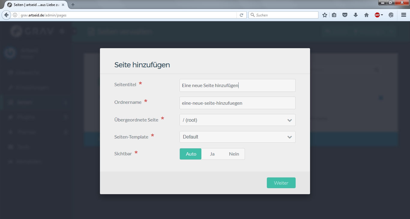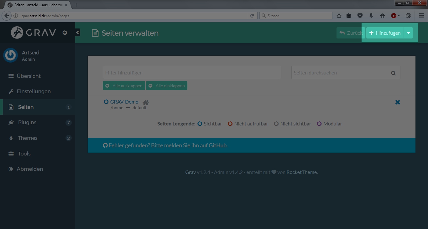 Wählen Sie im seitlichen Menü den Punkt "Seiten" aus und klicken Sie oben rechts auf "Hinzufügen".