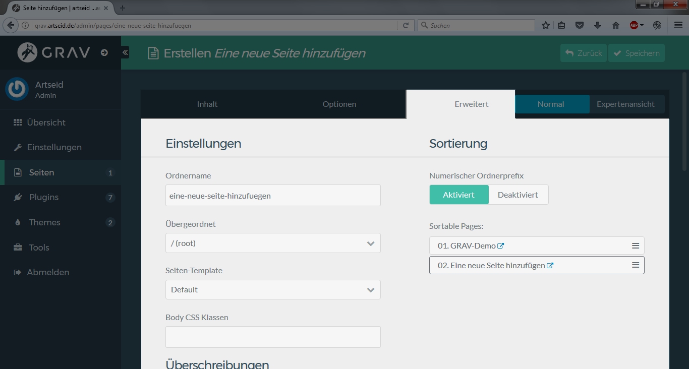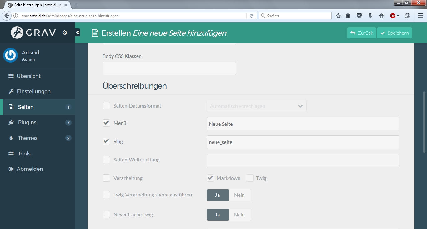 Nachdem Sie auf "Weiter" geklickt haben, gelangen Sie zur Bearbeitungsoberfläche der neu erstellten Seite. Unter dem Reiter "Einstellungen" können Sie im Abschnitt "Überschreibungen" den angezeigten Titel der Seite im Menü sowie die URL ändern ("Slug"), falls Ihnen der eigentliche Seitenname dafür ungeeignet erscheint.