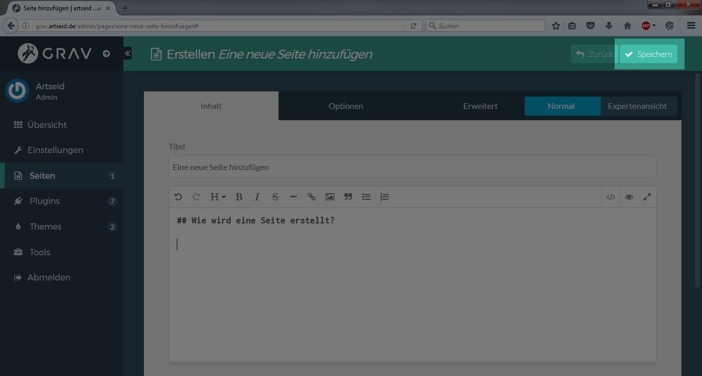 Unter "Inhalt" können Sie nun bereits Text hinzufügen. Bitte beachten Sie: Bilder und Dateien können erst nach dem ersten Speichern hochgeladen und eingebunden werden. Mehr dazu hier: Bilder und Seitenmedien.