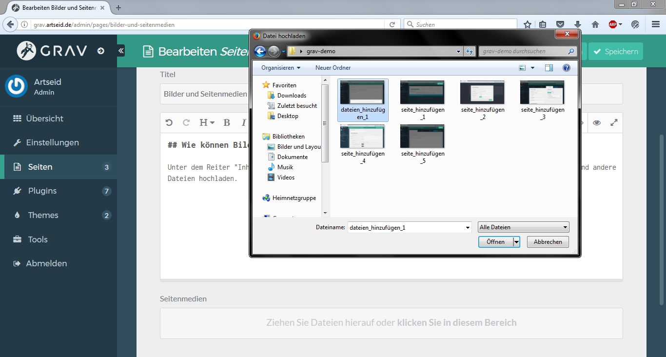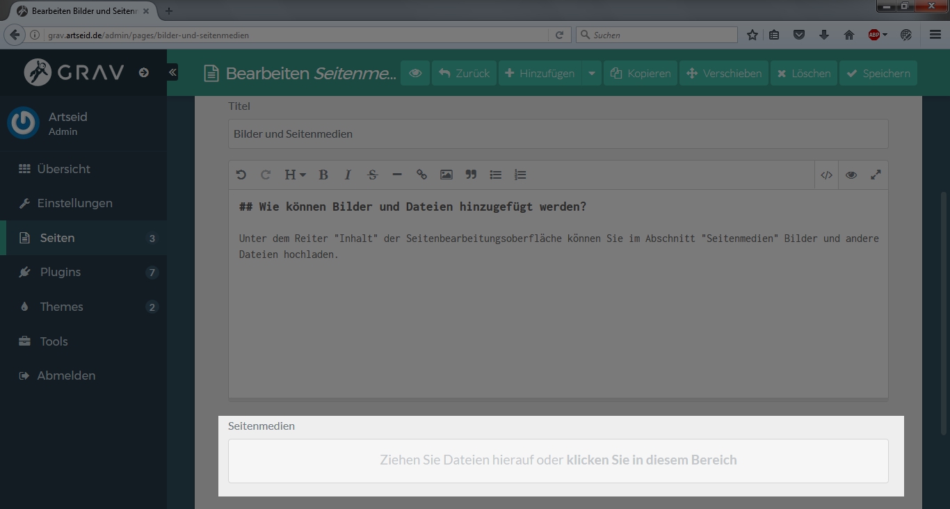 Unter dem Reiter "Inhalt" der Seitenbearbeitungsoberfläche können Sie im Abschnitt "Seitenmedien" Bilder und andere Dateien hochladen.