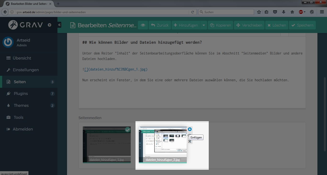 Im Gegensatz zu Bildern in allen gängigen Dateiformaten wird beim Hinzufügen von anderen Dateien standardmäßig nur der Dateiname angezeigt, welcher auf die Datei verlinkt, so dass diese heruntergeladen werden kann.